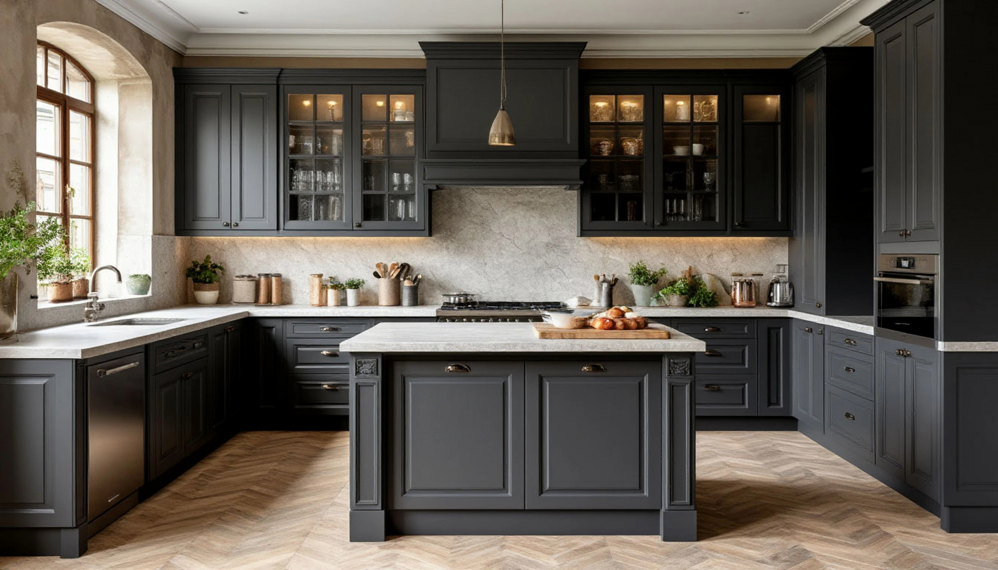 Кухни в римском стиле – это всегда история о величии, гармонии и изысканности, перенесенная в современное жилое пространство. Вариант "Тибур" от компании "Мебель Нашел" воплощает в себе лучшие традиции античности, интерпретированные через призму актуальных дизайнерских решений. Кухня в цвете графит с первого взгляда поражает своей глубиной и выразительностью: она одновременно сдержанна и величественна, строго симметрична и в то же время наполнена мягкой теплотой, которая превращает интерьер в место для жизни, а не только для приготовления пищи.