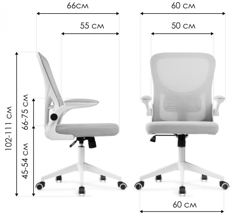 Высота подлокотников: 66 - 75 см. Высота спинки: 55 см. Диаметр крестовины: 60 см.